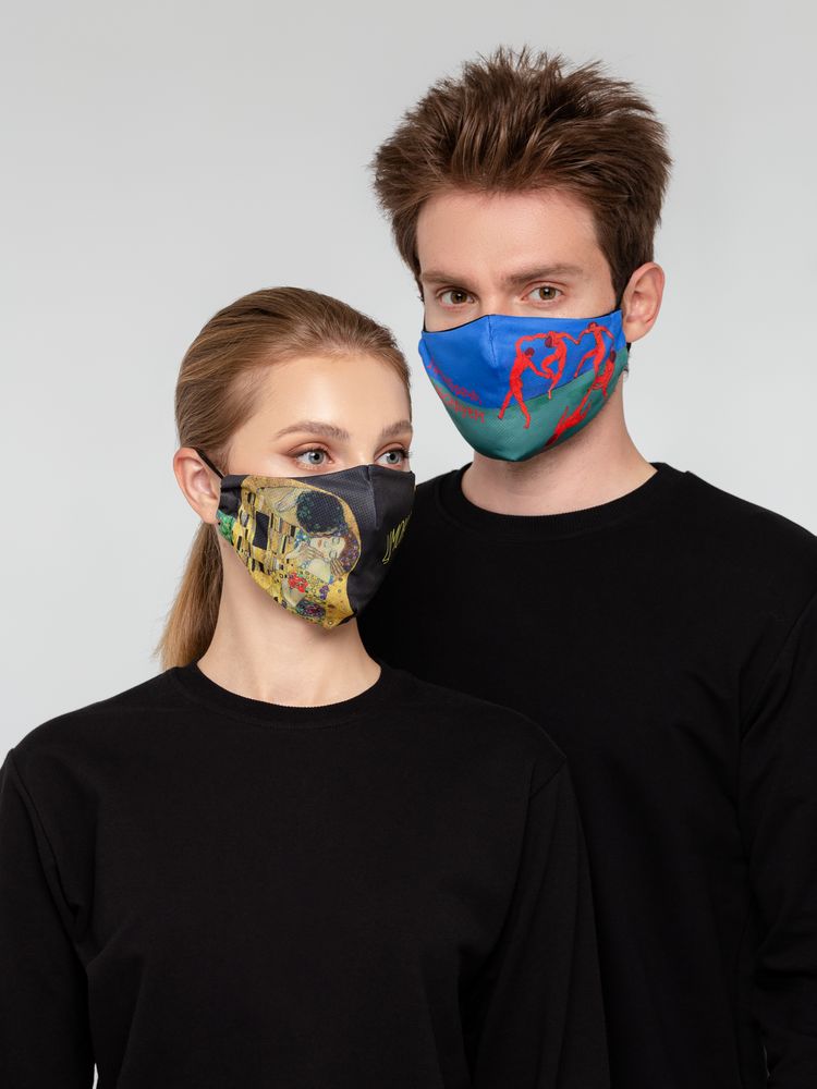 Принт создан по мотивам знаменитой картины Анри Матисса «Танец».Многоразовая маска из дышащей ложной сетки с ярким принтом с гигиенической хлопковой подкладкой и заушниками-резинками.