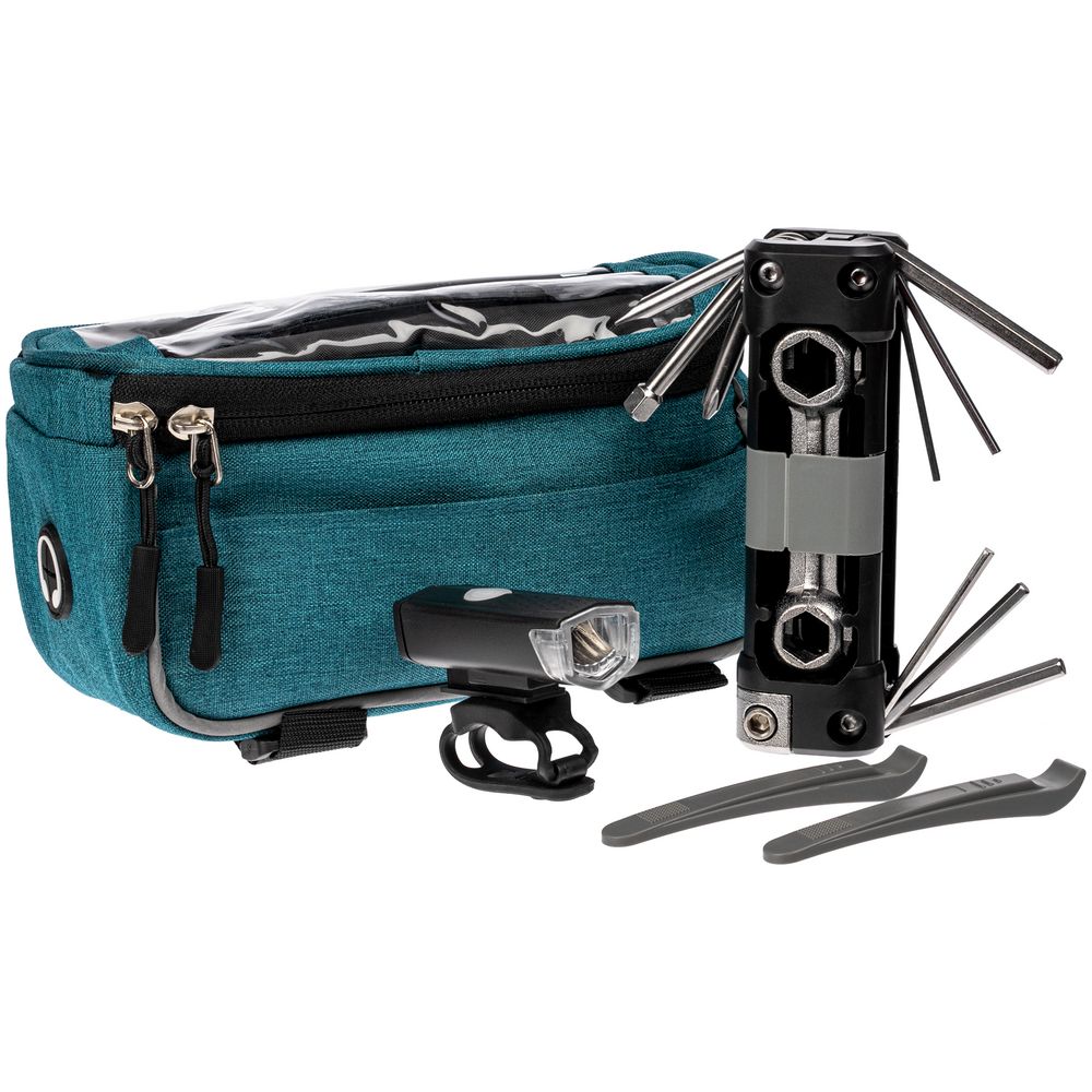 В этот набор входит все, что может понадобиться велосипедисту на вечерней прогулке: вместительная сумка для телефона и необходимых мелочей, мультитул, включающий в себя инструменты для обслуживания велосипеда, и фонарь, который не даст сбиться с пути в темное время суток.